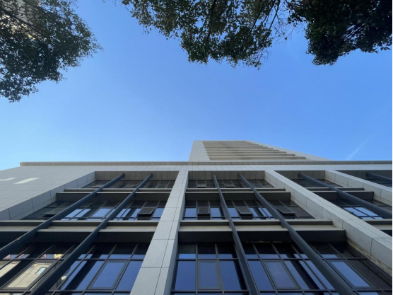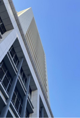 本案的立面设计与建筑内部功能紧密结合,立面造型虚与实结合。裙房设置通透的落地窗,塔楼根据房间分隔均匀布置外窗,具有良好的通风性能,方便室内空气的流通。山墙面采用实体墙,体现了立面设计与建筑功能相呼应的造型逻辑。裙房窗外挂竖向金属构件,塔楼窗外设置横向双线挑板,既是建筑遮阳功能的需要,也是线面结合设计手法的运用。裙房窗外的金属构件与窗户完全分离,实现了自由开窗的可能性。裙房为石材饰面,稳重大方;塔楼为仿石漆饰面错位勾缝,质感统一,细节丰富。外墙选用灰白色石材及真石漆,色彩搭配协调统一,颜色清新典雅,塔楼横向挑板凹槽处搭配的深色外墙涂料,强化了建筑立面的阴影关系。墙面材料质地与色彩的变化,塑造了医院建筑宁静、雅致的美感。